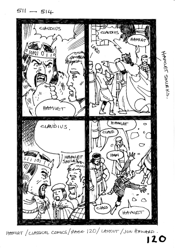 page 136 last panel is a large wide shot panel ,notice i made Hamlet a full figure in the center of the panel swinging in dynamic fashion with his sword ready for action against the Pirates, i also have Horatio's head in the corner of the panel half in shadow to add to the drama